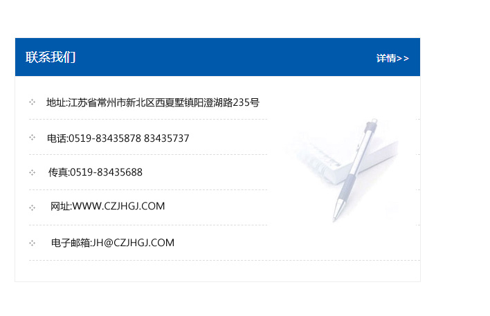 地址:常州市新北區友邦商務大廈1幢16、17層  電話:0519-85101652  傳真:0519-85112595  郵編:213022  網址:www.cz-jiayue_cn.jkjhsb.com  郵箱:xiajifengaa@163.com